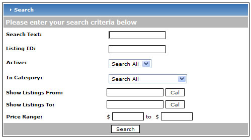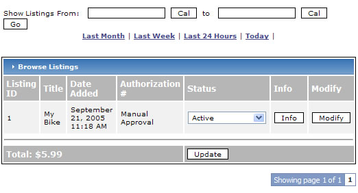 The "Browse Listings" page initially shows you any ads that have been placed today (since midnight). We've included 'Last Month', 'Last Week', 'Last 24 Hours' and 'Today' links so that you can easily display ads placed within each of those time periods. If you would like a different time span, you can enter the beginning and ending dates in the text fields and press the 'Go' button. The 'Cal' buttons will display a calendar where you can point and click to a specific date to enter their values in each field.