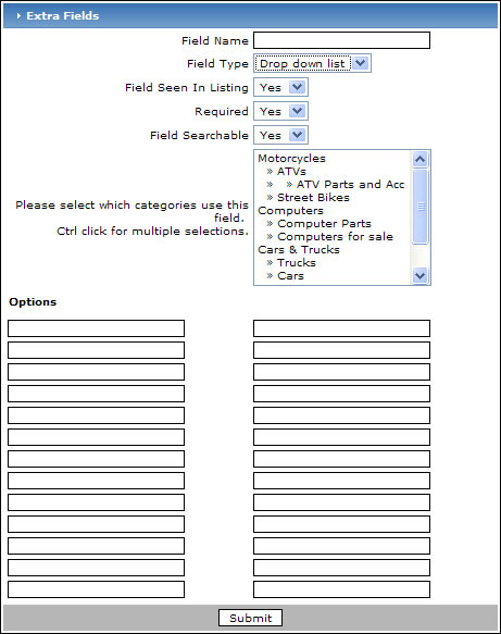 Please select which categories use this field. - When a customer decides to place an ad at your site, their first step is to choose the category where their ad will appear. You can designate which ad categories use the listing package here. To choose multiple categories, use the "Ctrl+click" method (hold down the CTRL key while choosing the categories the package is associated with).