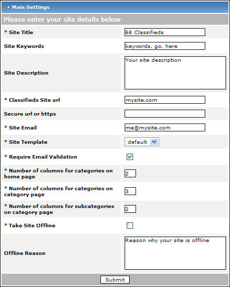 Site URL: Enter the location where you have installed the classifieds script (including the trailing slash "/"). If you have installed the site in a subfolder, enter the folder name after your site name (such as "http://www.yoursite.com/classifieds/").