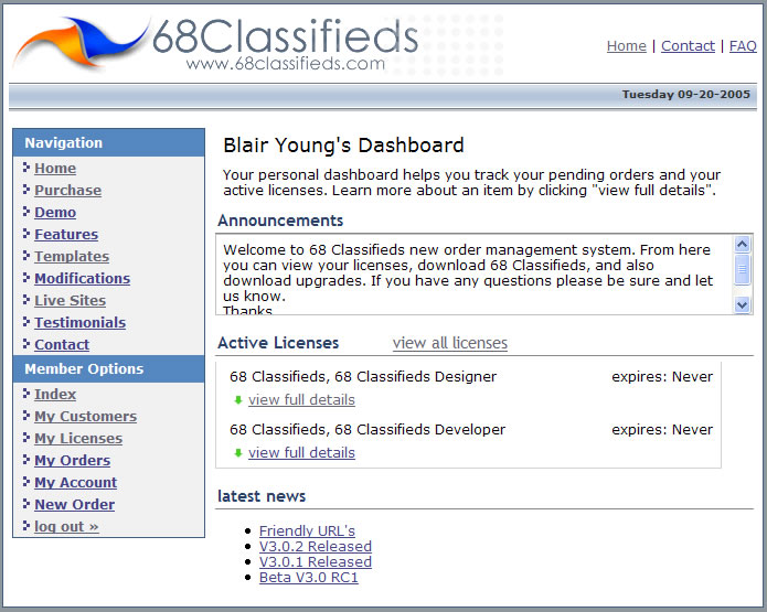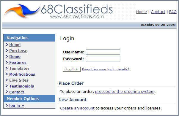 During checkout, you were asked to create an account. The username and password that you created will be used to login to the members area as well as the forum. The members area or 'dashboard' is where you will download 68 Classifieds, manage your account, obtain your licenses and purchase additional licenses if more classifieds sites are in your future. To login to the dashboard, visit http://www.68classifieds.com/members/index.php