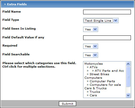 Field seen in listing - If you would like the information to appear in an ad's listing, choose "Yes", otherwise choose "No". An example of a field listing that you may want to create but not show up on an ad's page may be a "How did you find us?" field. It will then show up when the customer registers but won't show up in the customer's listing.
