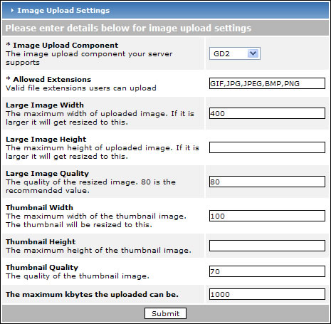 Image Upload Component - There are a number of image upload components that different servers support. You should contact your host in order to find out the correct component to choose in this field. An alternative (and probably quicker) method of determining the correct choice is to place an ad using each method. If the image upload isn't successful or the quality of the image isn't good, try the next method in the list.