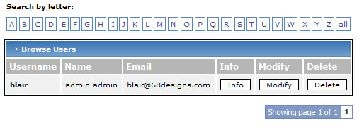 Alphabetical links are provided so that you can jump directly to members whose username begins with the letter you've clicked. Buttons are provided so that you can view the member's details, modify the member's details or delete the member.