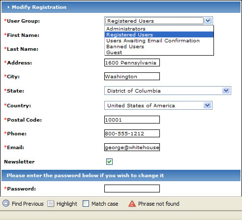 The search members page includes a form that helps you locate members. You can fill in as much or as little information that you have about a member in order to display a list of all members who fit your criteria. The first field, "Search Text", looks for matches in the member's username, name and email address. The form also allows you to filter results by User Group, State, Country and the date the member subscribed.