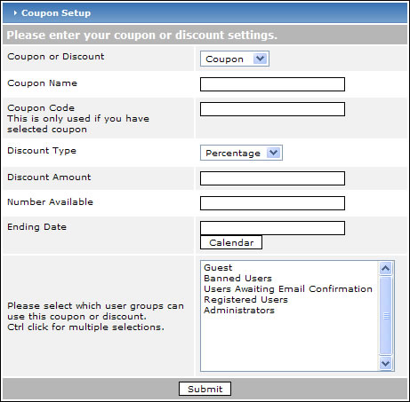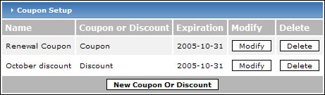 Create a coupon or discount - To create a new coupon or discount, press the "New Coupon or Discount" button. A new page appears where you will enter the specifics of the coupon or discount.