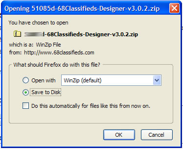 In the 'Available Downloads' area, there may be more than one file available for download. We recommend that you download and install the latest version of 68 Classifieds (version 3.0.2 as of this writing). Click on the appropriate link to download the files to your local computer. A window will open that gives you the choice of opening the file or saving it to your computer.
