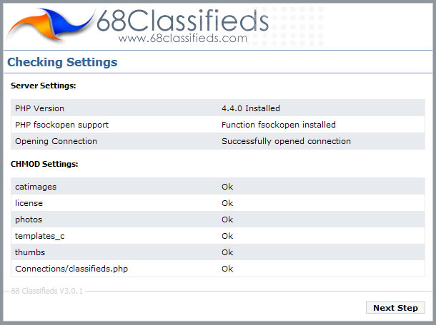 When all the server and CHMOD settings are correct, a button named "Next Step" appears. Click this button to continue to the next step.